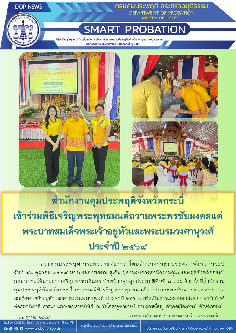 สำนักงานคุมประพฤติจังหวัดกระบี่ เข้าร่วมพิธีเจริญพระพุทธมนต์ถวายพระพรชัยมงคลแด่พระบาทสมเด็จพระเจ้าอยู่หัวและพระบรมวงศานุวงศ์ ประจำปี 2568
