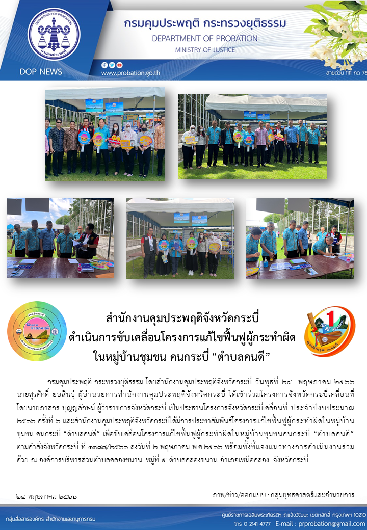 สำนักงานคุมประพฤติจังหวัดกระบี่ ดำเนินการขับเคลื่อนโครงการแก้ไขฟื้นฟูผู้กระทำผิดในหมู่บ้านชุมชน คนกระบี่ "ตำบลคนดี"